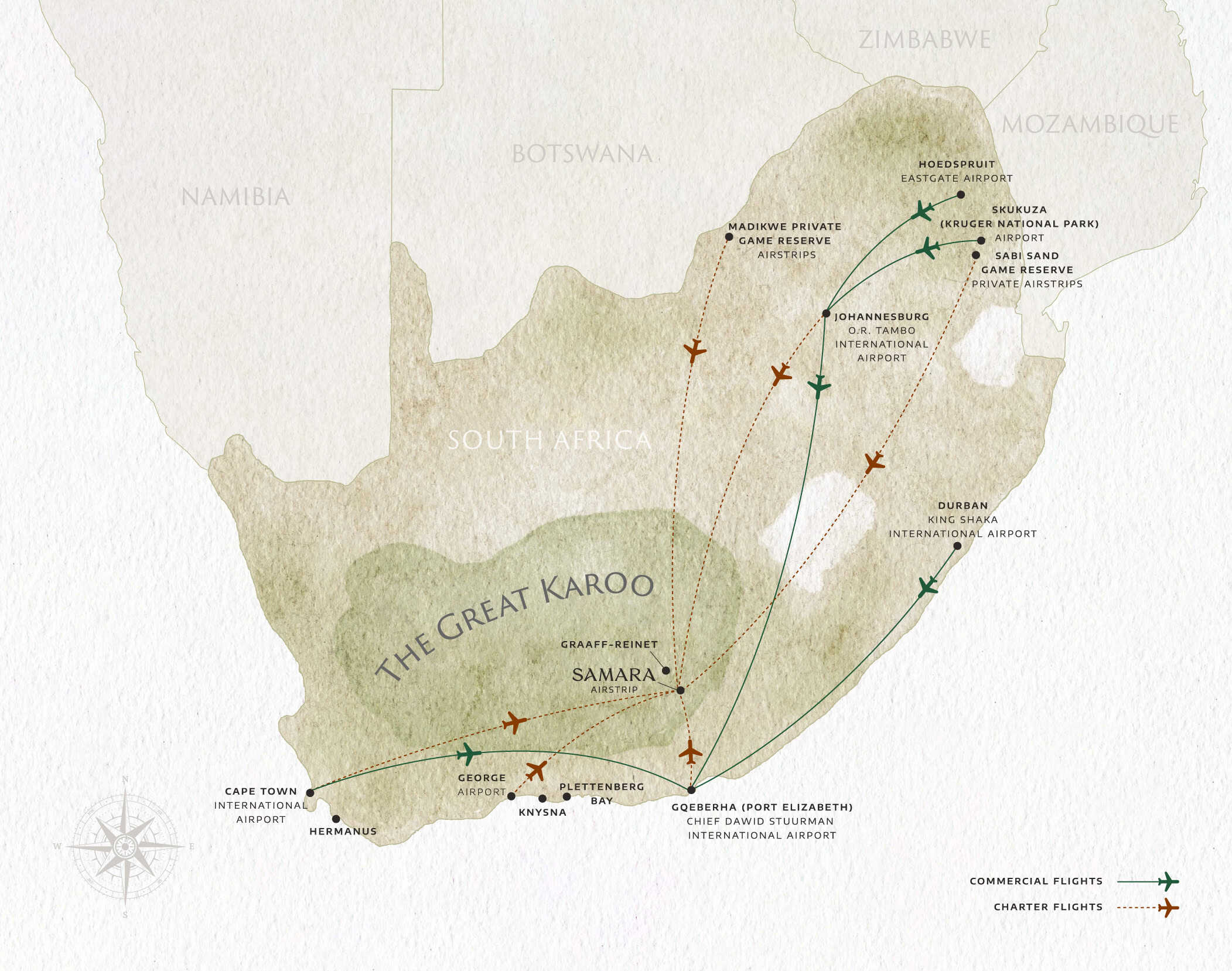 Our nearest major airport is in Port Elizabeth (now Gqeberha), serviced with daily commercial flights from Cape Town, Johannesburg and Durban. Once in Port Elizabeth, guests may either hire a car, take a road transfer or book a private charter flight onto Samara’s gravel airstrip.